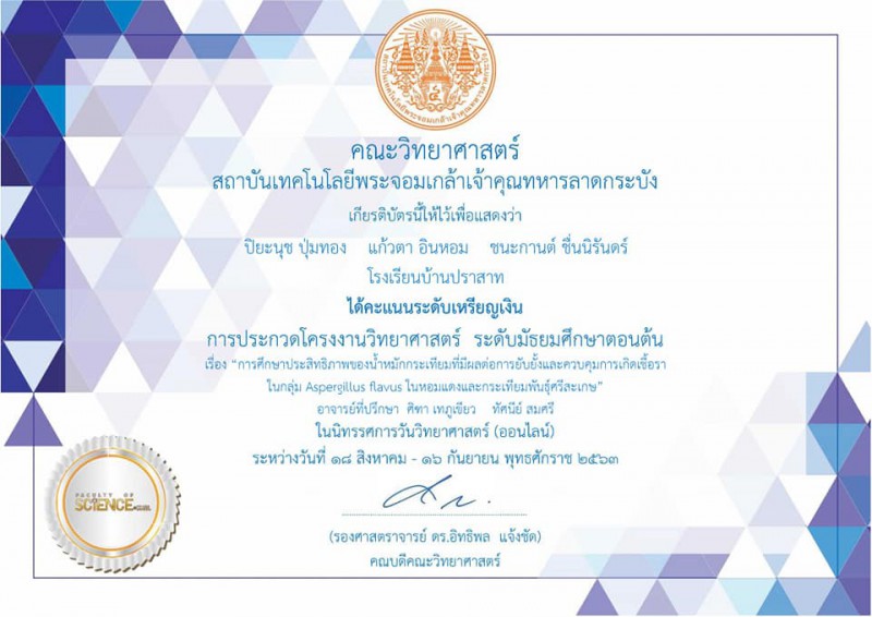 โรงเรียนบ้านปราสาท ได้รับรางวัลเหรียญเงิน จากการประกวดโครงงานวิทยาศาสตร์ คณะวิทยาศาสตร์ สถาบันเทคโนโลยีพระจอมเกล้าเจ้าคุณทหารลาดกระบัง ชื่อโครงงาน เรื่อง การศึกษาประสิทธิภาพน้ำหมักกระเทียมที่มีผลต่อการยับยั้งและการเจริญเติบโตของเชื้อราในกลุ่ม Aspergulas F