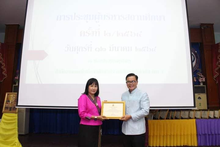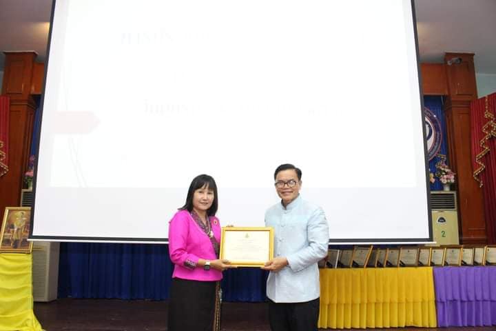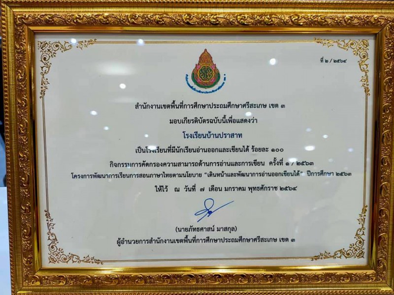 โรงเรียนบ้านปราสาท โดย ผอ.สุพิชชา ไพศาลสุวรรณ รับรางวัล โรงเรียนที่มีนักเรียนอ่านออกเขียนได้ ร้อยละ 100 จากท่านภัทธศาสน์ มาสกุล ผอ.สพป.ศก.3
