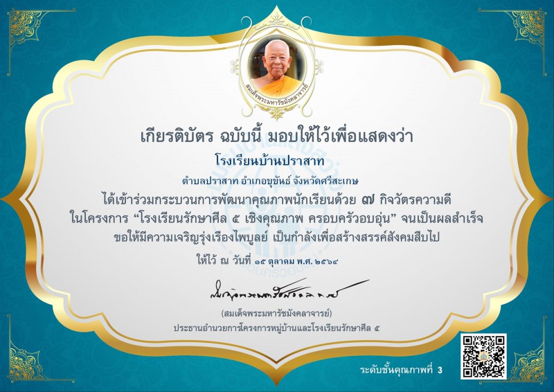30 พฤศจิกายน 2564 โรงเรียนบ้านปราสาท โดย ผอ.สุพิชชา ไพศาลสุวรรณ มอบเกียรติบัตรครูและนักเรียนที่เข้าร่วมกระบวนการพัฒนาคุณภาพผู้เรียนด้วย 7 กิจวัตรความดี ในโครงการ "โรงเรียนรักษาศีล 5 เชิงคุณภาพ ครอบครัวอบอุ่น" จนเป็นผลสำเร็จ