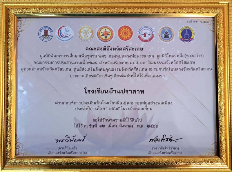 15 สิงหาคม 2566 ขอแสดงความยินดีกับโรงเรียนบ้านปราสาท ผ่านเกณฑ์การประเมินเป็นโรงเรียนศีล 5 ตามรอยพ่ออย่างพอเพียง ประจำปี 2565 ระดับยอดเยี่ยม