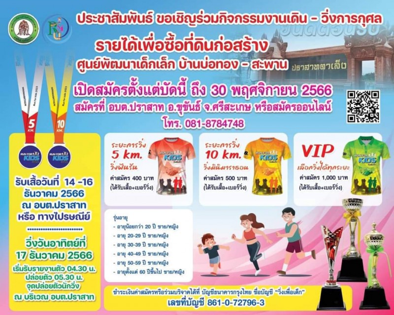 30 พฤศจิกายน 2566 โรงเรียนบ้านปราสาท ตำบลปราสาท อำเภอขุขันธ์ โดย ผอ.เดชา จันดาบุตร และคณะครูทุกคน ได้ร่วมสนับสนุนโครงการเดินวิ่งการกุศล วิ่งเพื่อเด็ก Run For Kids 2023 เพื่อหาเงินทุนซื้อที่ดินก่อสร้างศูนย์พัฒนาเด็กเล็กบ้านบ่อทอง - สะพาน จัดโดยองค์การ